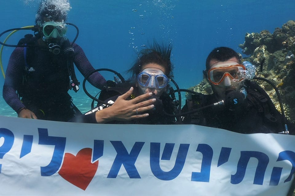 במועדון שלט "מזל טוב!" מוכן מראש, שלט "התינשאי לי" למעוניינים להציע נישואין מתחת למים